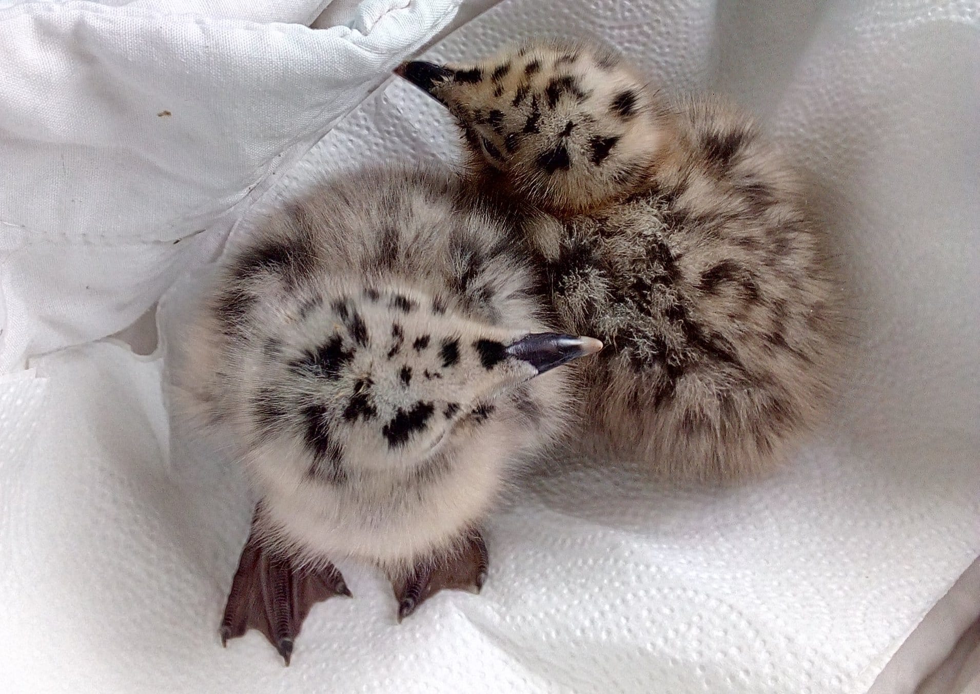 When Gulls are first born they make take a day to liven up but after that they should be running around like clockwork balls of fluff. It is the running around urge that gets them into trouble. Many chicks fall off roofs where the parents build nests. Although the chicks do not stay in the nest they will explore the roof and occasionally go back to the nest area to sleep. If a chick is lively with no injuries, and you know which roof they came from, then they can be put back on the edge of the roof and they will walk back up to the top. Some roofs are too high to reach so these chicks need to come in to a rescue centre. If a chick is put back on the wrong roof they could be attacked by rival adults.