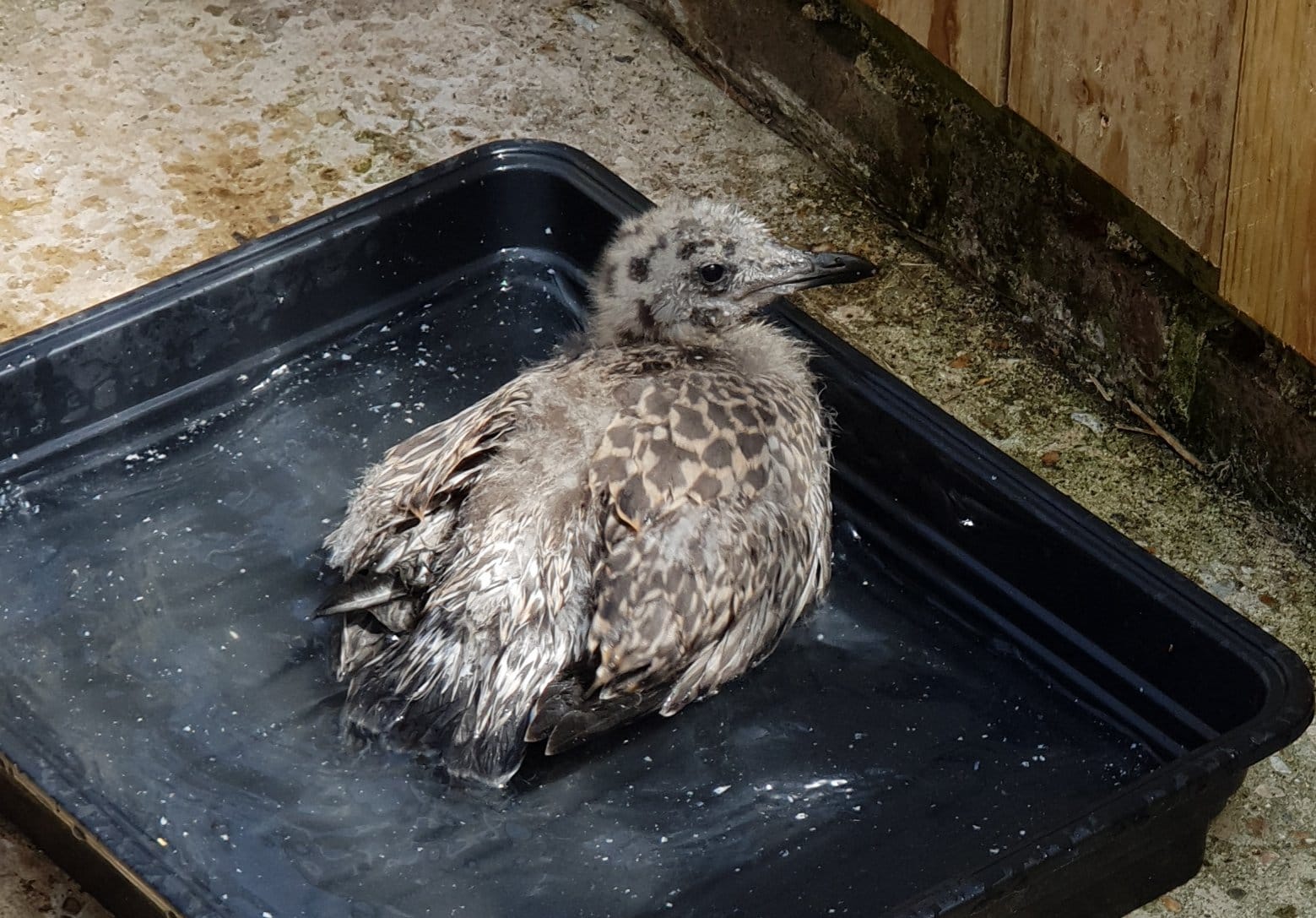 At 4 weeks approx. we will introduce shallow trays of water to encourage preening and to make sure the babies are waterproof. Pools will be given once they are waterproof; any sooner and they could drown in the water. Before release Gulls must be flying, waterproof and used to rushing for a variety of foods.